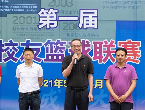 上午9:30,在首届校友篮球联赛开幕式上,校长余敏明致开幕辞,他代表学校党政领导班子和全体师生员工对返校参加球赛的校友们表示热烈欢迎,希望通过相关赛事活动,增进广大校友和学校之间的联系,创造更多的合作共赢机会。他预祝活动取得圆满成功,并希望所有参赛选手都能够团结协作、赛出水平、赛出友谊,展现成信人的体育拼搏精神和热血青春风采。