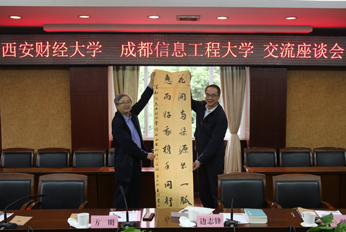 方明对学校的热忱接待表示感谢,并简要介绍了西安财经大学的基本情况和此次调研的背景。他表示,成都信息工程大学近年来发展迅速,专业建设从一开始就有全盘规划,工作思路值得肯定,令其大受启发。随后代表西安财经大学向学校赠送了教师编写的书籍及书法。