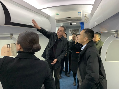 在航空服务实训基地负责人黄强的讲解下,余敏明一行参观了安检实训区、模拟机舱、应急逃生区、多媒体教室、形体塑造室等区域,并询问了航空服务专业招生、实训基地建设、培训学员实训等情况。实地考察后,相关人员进行了调研座谈交流。