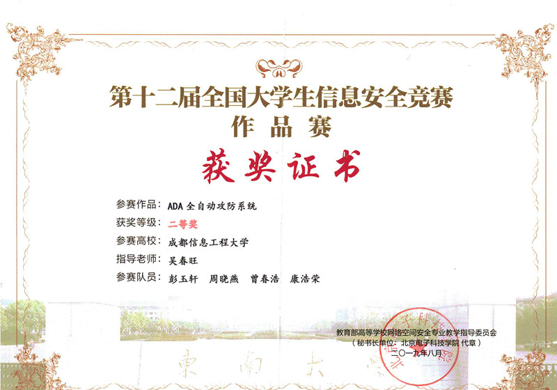 【本网讯】8月3日,第十二届全国大学生信息安全竞赛作品赛决赛在东南大学落下帷幕。本次全国大学生信息安全竞赛由教育部高等学校网络空间安全专业教学指导委员会和中国互联网发展基金会共同主办。我校网络空间安全学院的彭玉轩、康浩荣、曾春浩、周晓燕四名同学共同完成的作品《ADA全自动攻防系统》以优异的成绩入围决赛,以总排名第50获得全国二等奖,实现了我校参加全国大学生信息安全竞赛作品赛获奖零的突破。