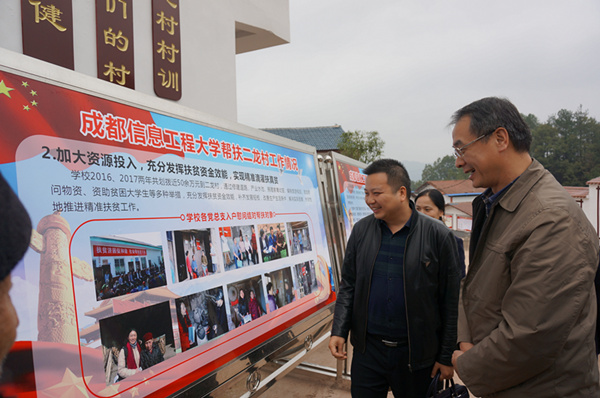 余敏明一行先后走访了二龙村小学、农房改造、旅游示范点,开展了贫困户入户慰问,代表学校为二龙村授“成都信息工程大学实践教学基地”牌匾,捐赠20多套党建工作学习材料,并就扶贫政策、资金、项目落实及存在问题与村两委开展了深入座谈。他欢迎乡村各级干部前来我校进行社会实践授课,帮助师生正确分析实践活动中发现的问题,用乡村的发展理念启发学生探索、鉴别、思考、研究和发展,提高学生实践能力。他希望二龙村充分用好各项扶贫政策,灵活发挥扶贫资金效能,持续保障资金精准滴灌。争取成为产业发展试点地区,稳定增加村集体经济收入,带动贫困户走上自主脱贫致富的可持续发展道路。他表示,学校将发挥智库优势,充分调动资源,做好项目调研,协调二龙村与上级扶贫主管部门沟通,解决具体问题。