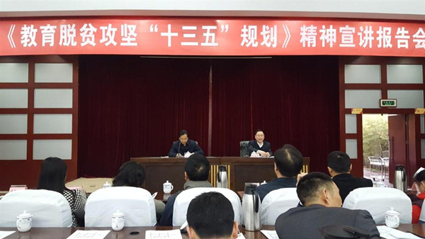 张澜涛希望各地各校要及时传达学习领会宣讲会精神,突出教育脱贫工作重点,做到义务教育有保障,抓好教育脱贫项目落实,强化工作责任。