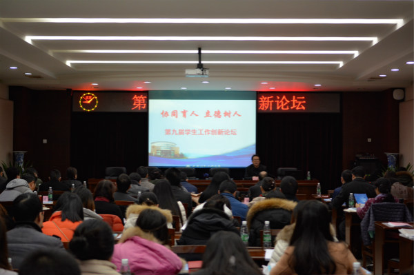 【本网讯】1月11日上午,学校在行政楼第一会议室举办第九届学生工作创新论坛。学校党委书记赖廷谦、副书记敬枫蓉、副校长于世祥出席会议,相关职能部门负责人,各学院党总支书记、副书记,马克思主义学院负责人,文化艺术学院素质教育研究室负责人,全体辅导员老师及学生工作处全体人员参加了会议。会议分为总结表彰和专题报告两个阶段,会议由于世祥主持。