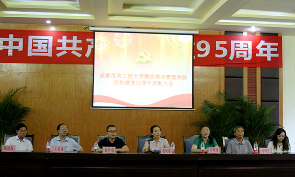 【本网讯】6月30日,成都信息工程大学银杏酒店管理学院在学术厅隆重召开庆祝中国共产党成立95周年表彰大会,学院党政领导敬枫蓉、桑作银、龚燕、兰家隆、陈进忠、沈锦渝、刘明亮、黄芳等,党委委员、总支书记、支部书记、党口部门负责同志、全体辅导员以及受到表彰的先进集体和个人代表参加了大会。表彰大会由党委副书记、纪委书记龚燕主持。