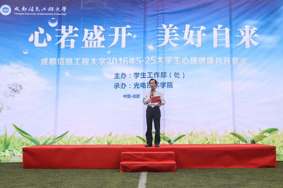 【本网讯】5月13日上午,由学生工作处主办、光电技术学院承办的成都信息工程大学2016年5·25大学生心理健康月开幕式在航空港校区第一田径场隆重举行。学校党委书记赖廷谦,校党委常委副校长于世祥,相关职能部门负责人,各学院党总支书记、副书记、心理辅导员和学生代表等1000余人参加了本次开幕式。