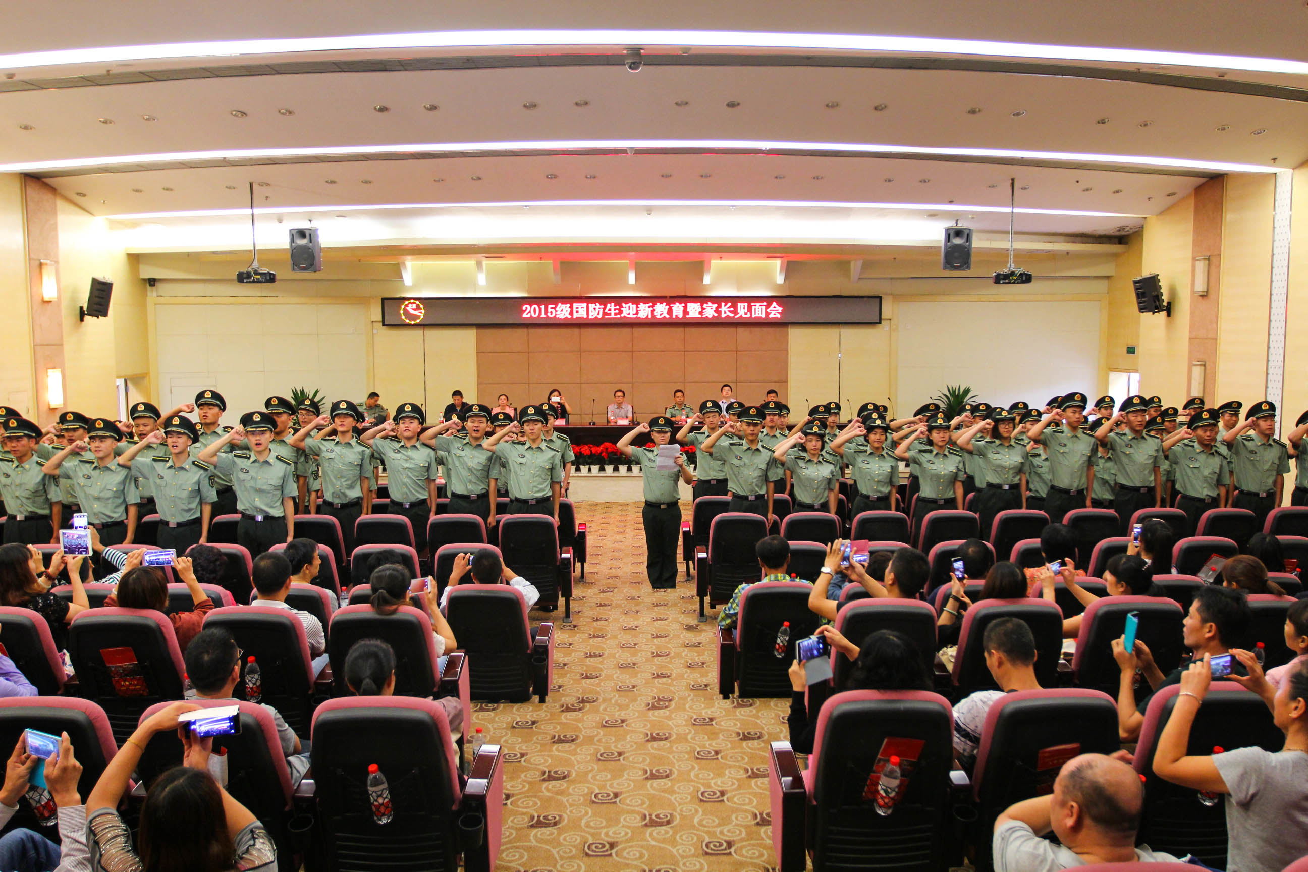 “我为我今天的选择而骄傲,我为我明天的事业而自豪,我必将坚定从军信念,献身强军实践……”9月10日,学校在国际会议厅召开了成都信息工程大学2015级国防生迎新教育暨家长见面会。学校副校长于世祥,驻校选培办王主任,学生工作处处长戴丽红、副处长陈智勇,大气科学学院党总支副书记缪燕平、资源环境学院党总支书记刘绍全、信息安全工程学院党总支书记许鸿涛,驻校选培办干事,学生工作处老师,全体2015级国防生新生及部分高年级国防生参加了会议。