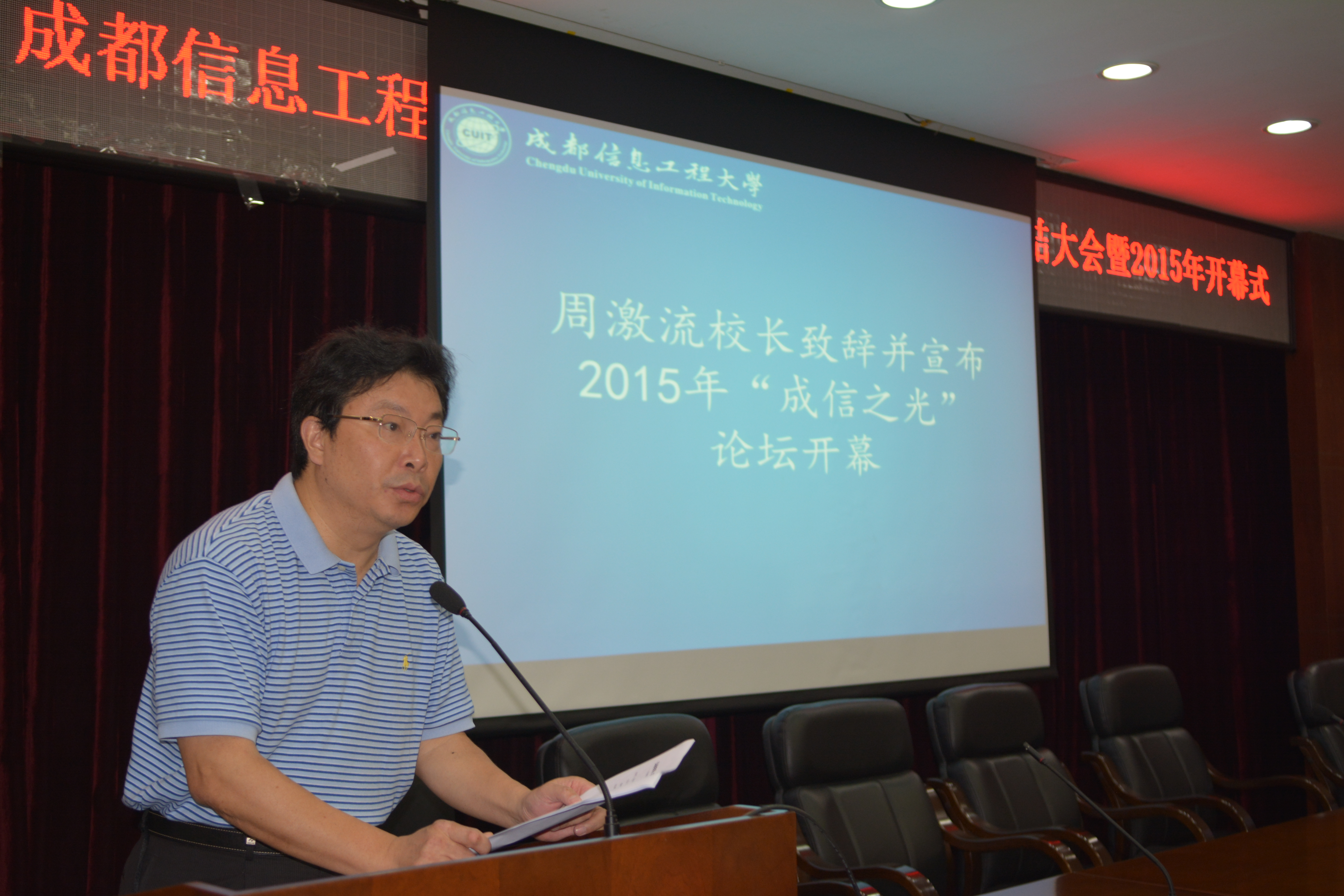 周激流为2015年“成信之光”论坛致辞。他感谢各位领导、专家、老师和同学为2014年论坛的成功举办以及本届论坛顺利召开所作的努力。他指出我校成功更名为成都信息工程大学,既是对学校多年来矢志不渝改革创新、各项事业实现跨越发展的高度认可,也赋予了学校在未来的发展过程中,更好地服务国家战略和四川经济社会发展的历史责任和使命;周激流指出“互联网+”时代给我校研究生教育培养带来了新的机遇,以及我校研究生培养需要加强学科之间的相互融合、渗透。学科间的融合渗透,既可以为传统学科带来生机和活力,给新兴学科提供生长点,又可以为人才培养、科学研究和服务社会提供了良好的发展空间和平台,我校研究生教育就是要以培养高素质应用型高级专门人才为根本,大力实施“以人为本,融合开放,服务行业,服务地方”的发展战略,要秉承“成于大气,信达天下”的校训,着力提高研究生的综合素质和能力。