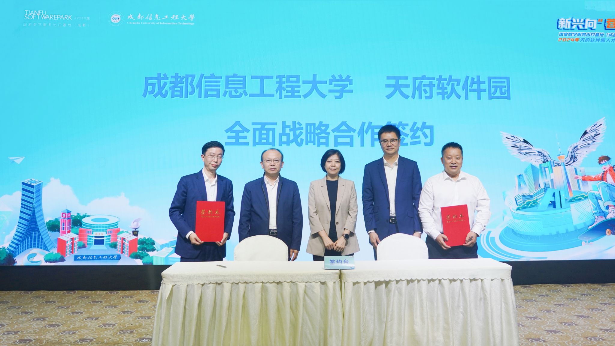 在校企签约仪式上,舒红平和朱云凯分别代表双方单位,签署了成都信息工程大学——天府软件园校企全面战略合作协议。袁兰兰、何建新、蔡伟见证了双方开启深度合作、共创辉煌的里程碑时刻,并共同开启了天府软件园人才周活动的序幕。