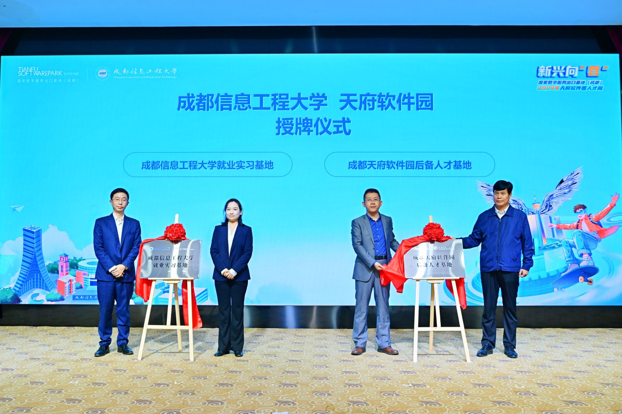 在授牌仪式上,学校招生就业处、科技处负责同志与天府软件园负责人共同为“成都信息工程大学就业实习基地”和“成都天府软件园后备人才基地”揭牌。