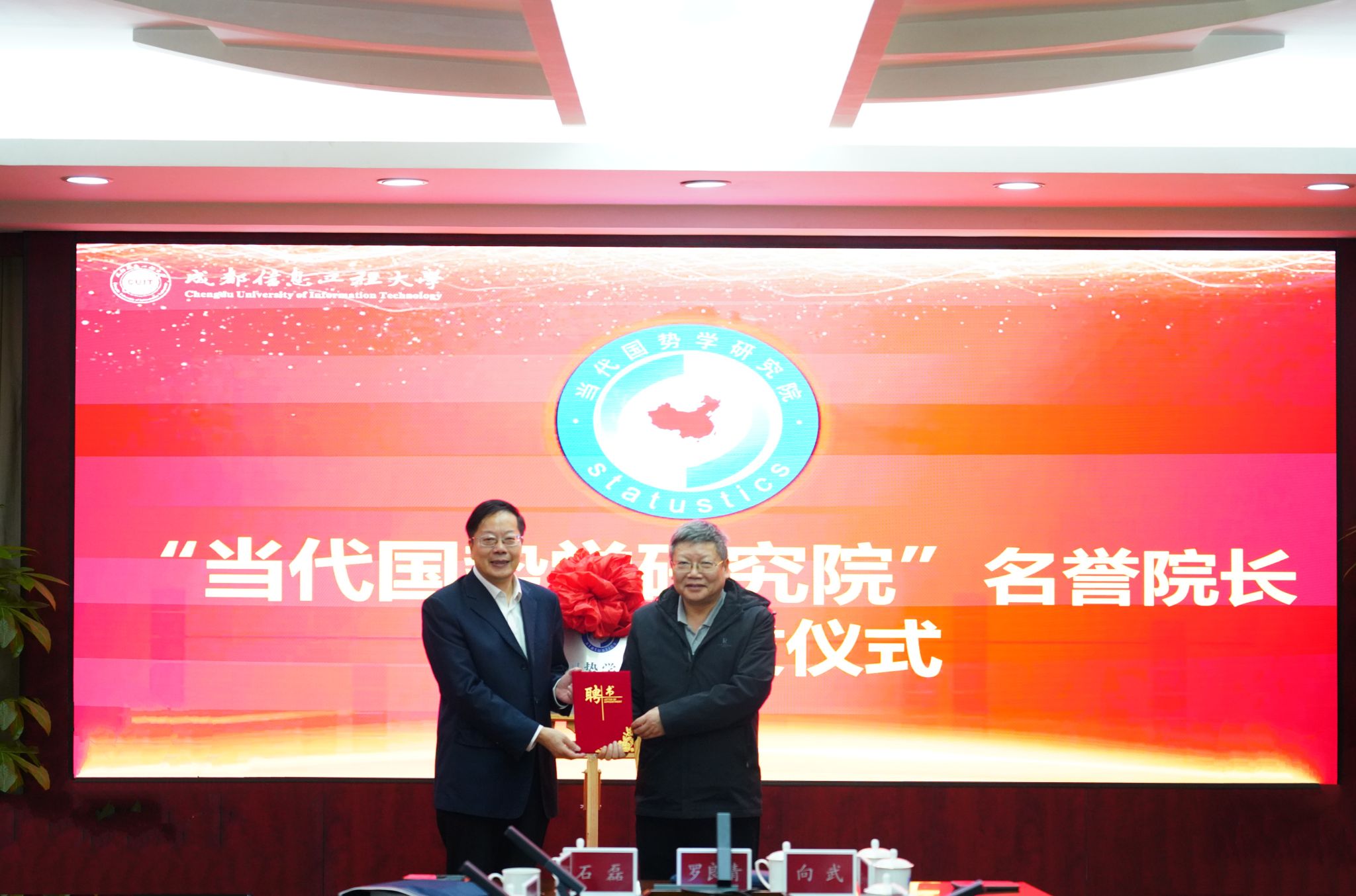 在毛有丰、许宪春、文兼武等领导和专家的见证下,国家统计局统计教育培训中心主任齐占林将国家统计局与四川省人民政府共建成都信息工程大学协议文本交给沈火明。