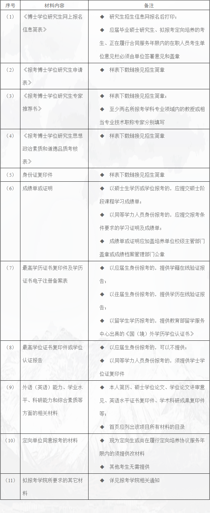 考生须将报考申请材料扫描后在中国研究生招生信息网以附加材料的形式上传(生成报名号后点击“填写附加信息”进行材料上传,否则不能完成报名信息采集),并于3月28日前将纸质材料寄送至报考学院。其中,材料(1)-材料(9)为各类考生必交材料,材料(10)为申请考核、硕博连读考生必交材料,材料(11)为各类考生根据学院要求提交的材料。