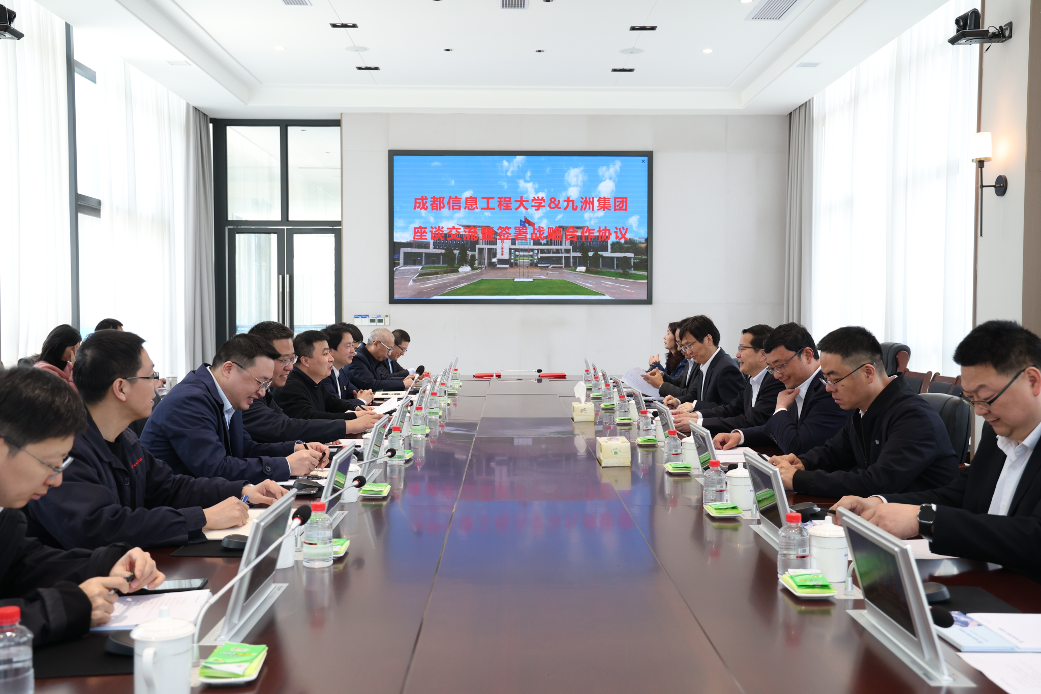 杨保平对沈火明一行的到来表示热烈欢迎。他指出九洲集团与成都信息工程大学有着很好的合作基础,这次战略合作协议的签署,勾勒了校企合作新蓝图,将进一步发挥双方在技术、人才、市场等方面的优势,共同推进产学研深度融合与区域经济高质量发展。