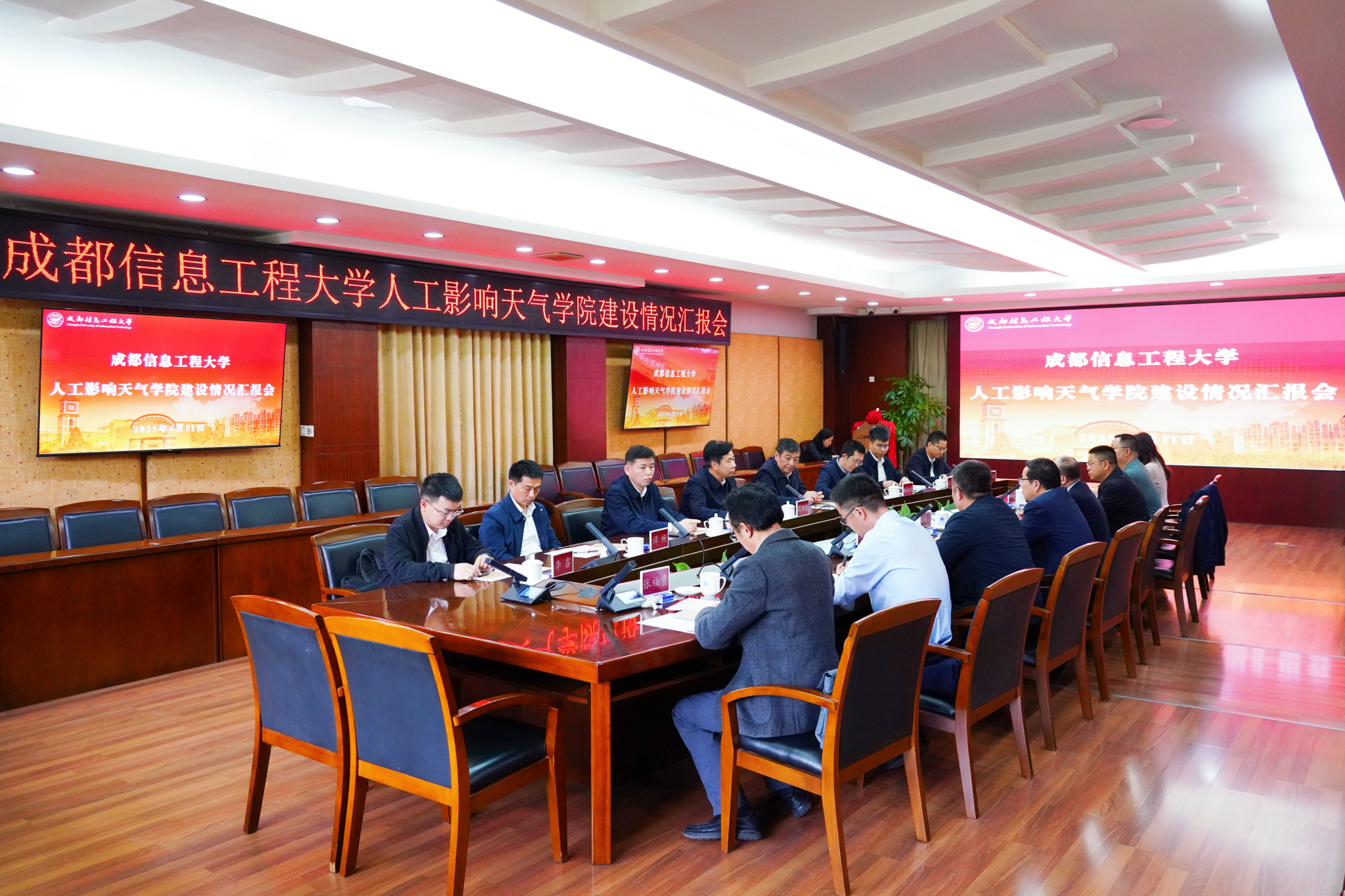 【本网讯】4月11日上午,成都信息工程大学人工影响天气学院建设情况汇报会在航空港校区举行。中国气象局党组成员、副局长熊绍员,四川省气象局党组书记、局长彭军,四川省气象局党组成员、成都市气象局局长谭畅,学校党委书记沈火明,校长何建新,副校长舒红平、何晋参加。会议由舒红平主持。