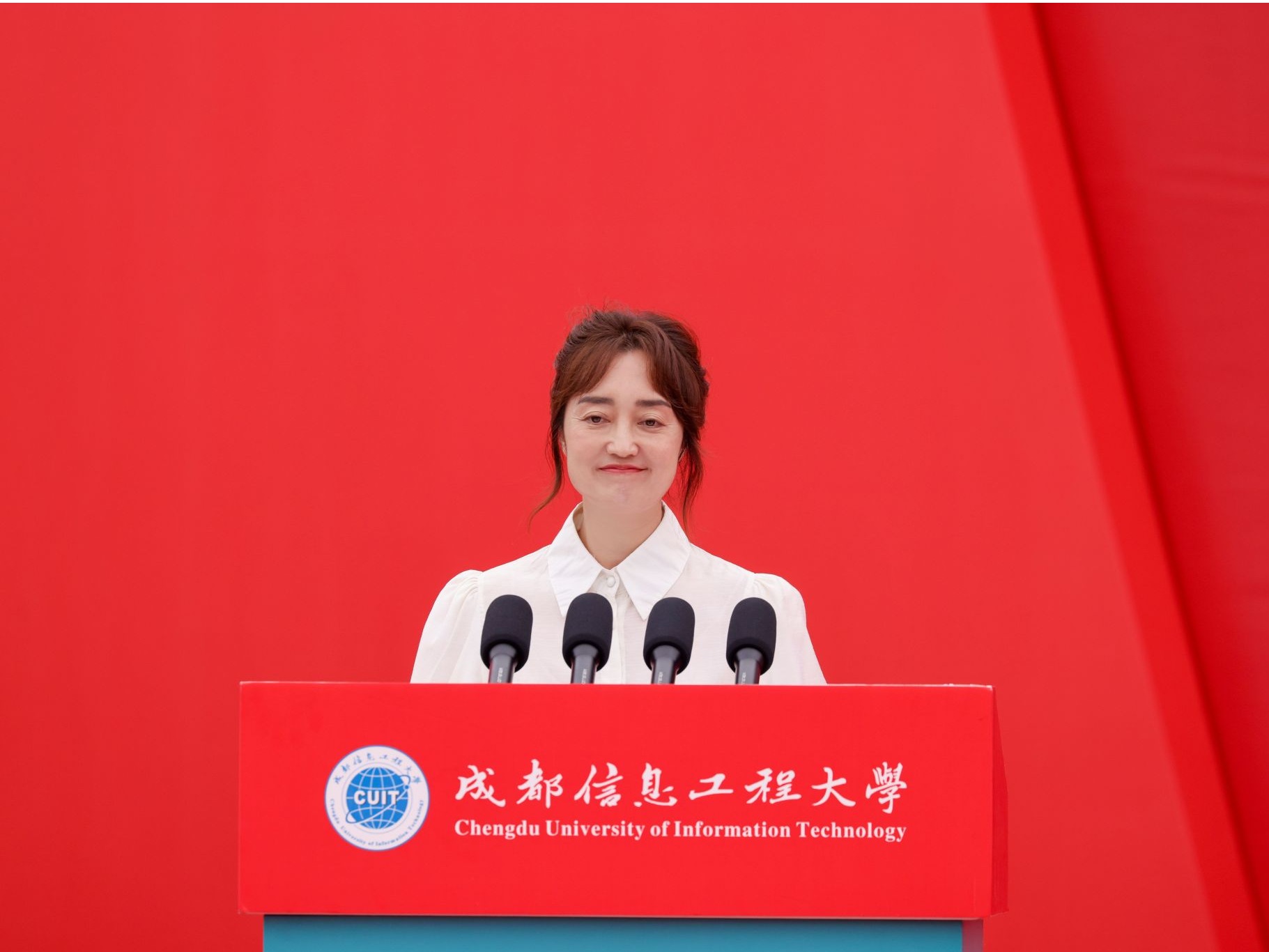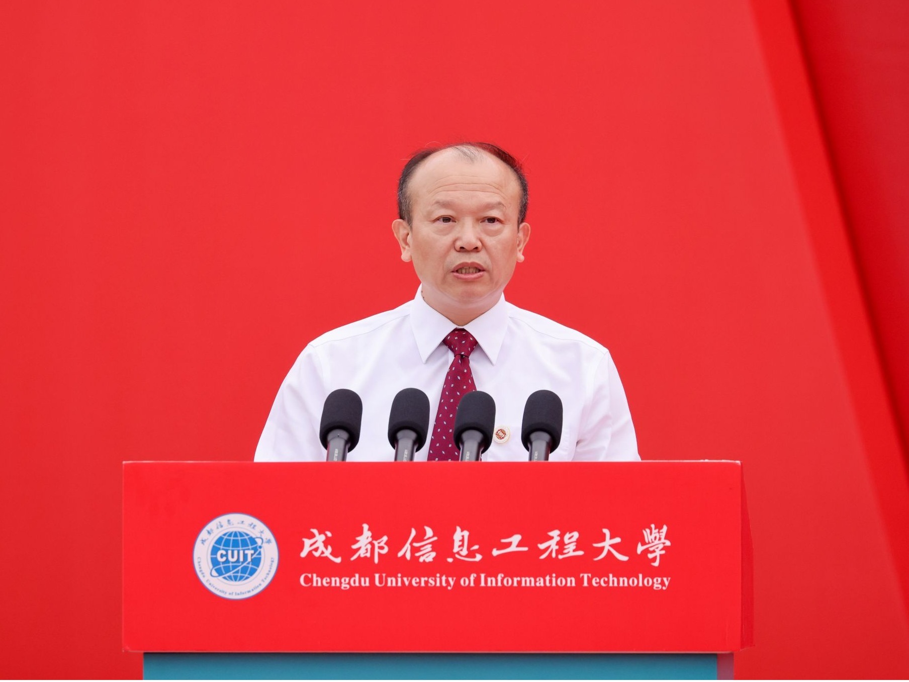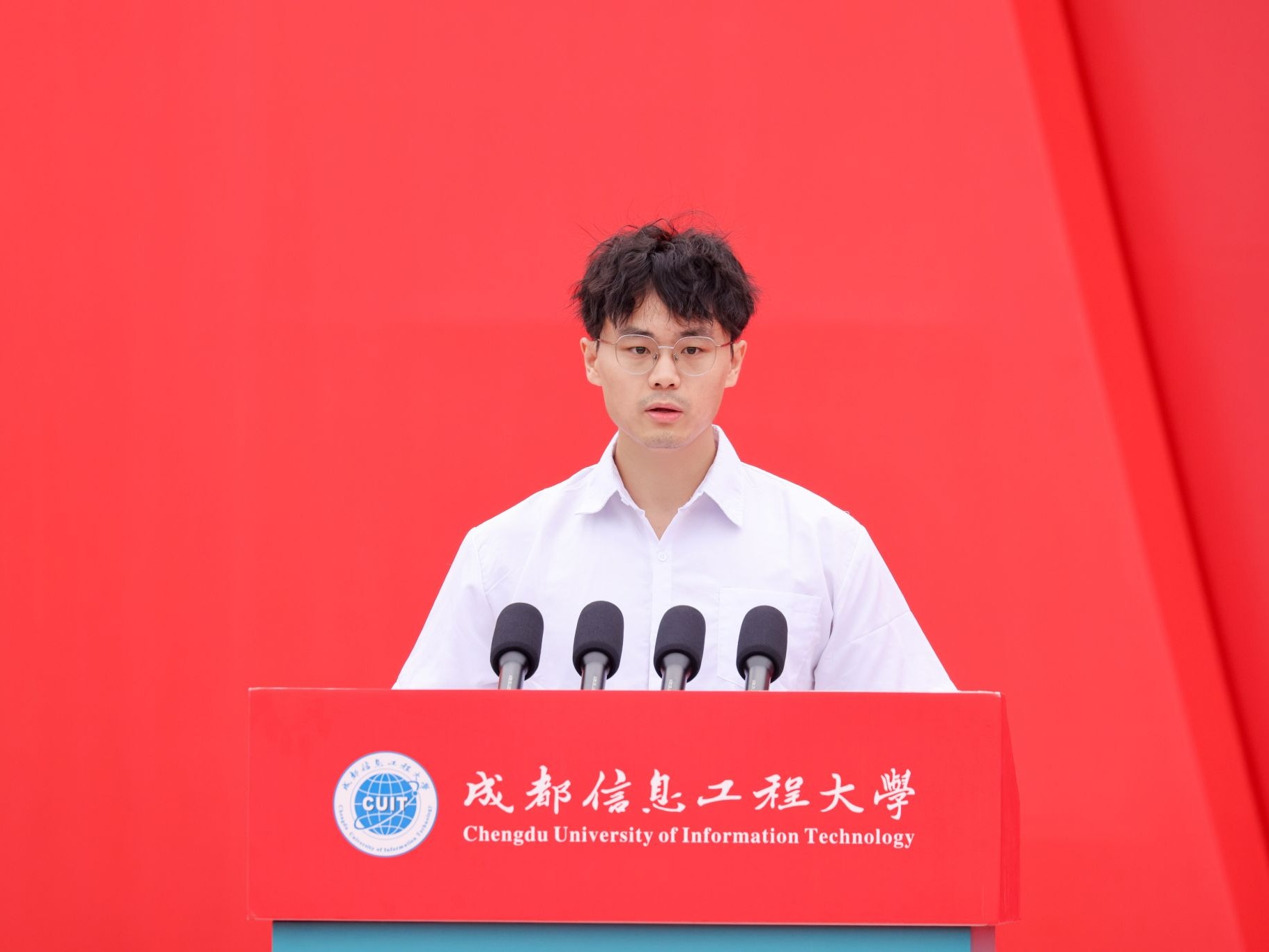 随后,主席台就座的领导和教师代表为新生代表佩戴成都信息工程大学校徽。这枚校徽不仅是“成信人”身份的象征,更是奉献青春力量,展现青年担当的使命传承。