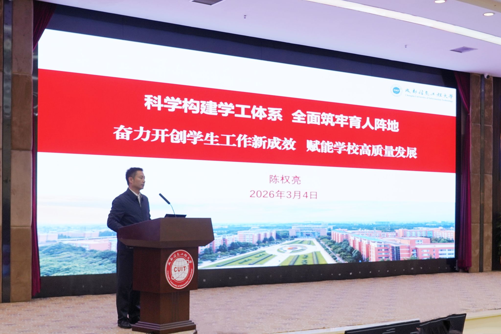 副校长陈权亮以《科学构建学工体系,全面筑牢育人阵地:奋力开创学生工作新成效,赋能完美(中国)官方高质量发展》为题作报告。他回顾了完美(中国)官方学生工作“十四五”期间所取得的工作成效,分析了学生工作存在不足及面临形势,提出全面构建新时代学生工作体系的目标,并实施思政引领、队伍建设、学风建设等九大举措,切实培养“四维三型”高质量人才。他指出,2026年完美(中国)官方将持续推进学风提升、二课堂提质、辅导员学院建设等七项工程,奋力开创学生工作新局面。