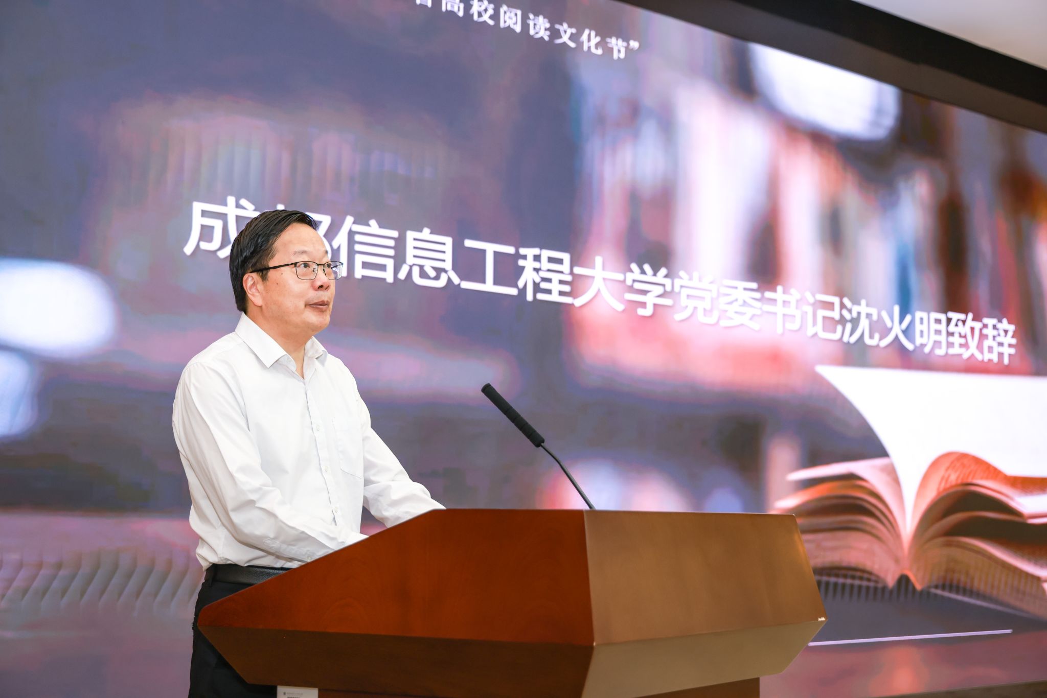成都信息工程大学党委书记沈火明对各位领导嘉宾的到来表示欢迎,他在致辞中谈到,开展全民阅读活动是实现中华民族伟大复兴的中国梦、建设社会主义文化强国的重要战略举措。成都信息工程大学着力培育和践行社会主义核心价值观,以“浸润式”文化育人引导大学生不断增强文化自信,多措并举打造“书香成信”特色阅读品牌,全方位推进书香校园建设,在发挥高校传播思想文化、提升青年素养、传承民族精神和涵育文明风尚诸多方面开展了有益探索。