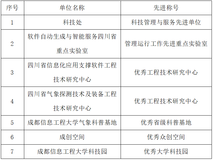 会上对2022年度科技创新工作成效突出的41家部门(单位)以及有关市(州)科技局、园区、平台予以通报表扬。在部门(单位)先进表彰名单中,学校科技处获“科技管理与服务先进单位”,此次共有川大、电子科大等10所高校的科研管理部门获得表彰;在平台先进表彰名单中,软件自动生成与智能服务四川省重点实验室获“管理运行工作先进重点实验室”,四川省信息化应用支撑软件工程技术研究中心、四川省气象探测技术及装备工程技术研究中心获“优秀工程技术研究中心”,成都信息工程大学气象科普基地荣获“优秀省级科普基地”,成创空间获“优秀众创空间”,成都信息工程大学科技园获“优秀大学科技园”(此次共有西南交大、电子科大等8所高校的大学科技园入选)。