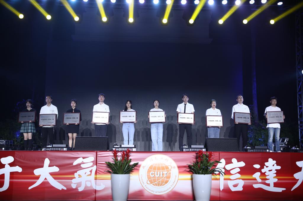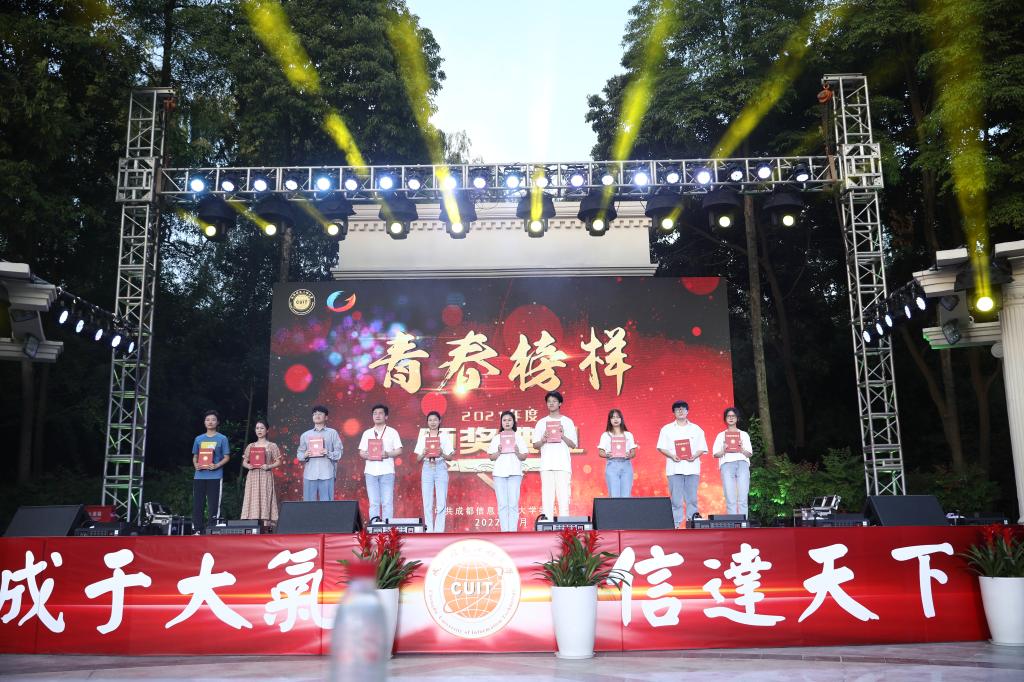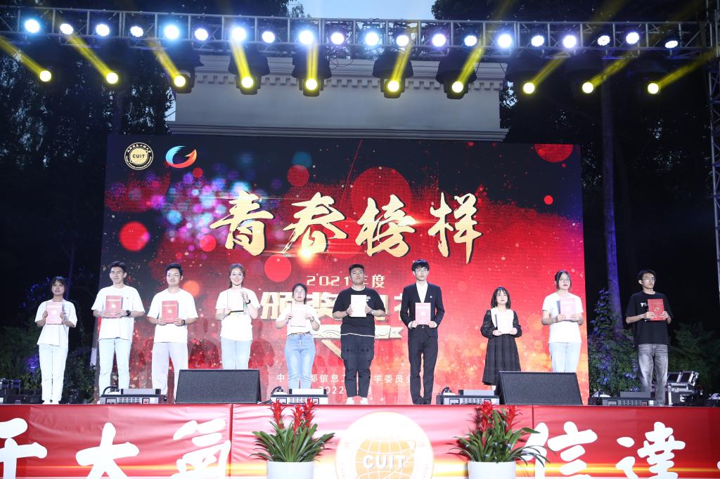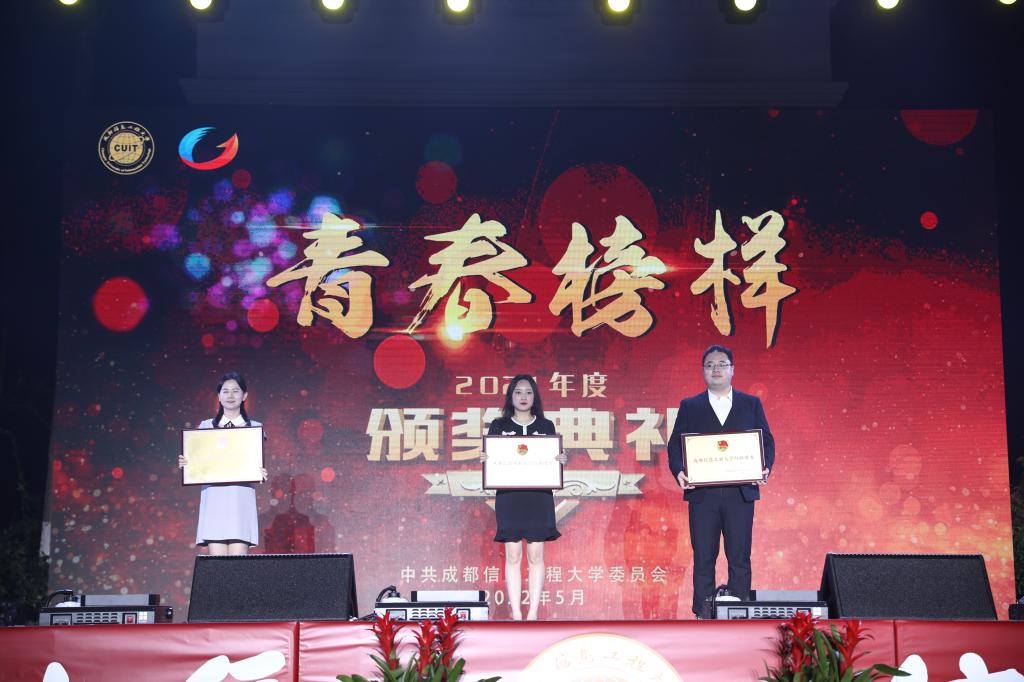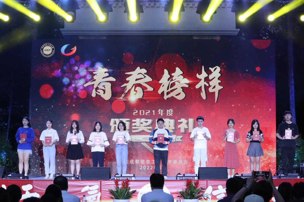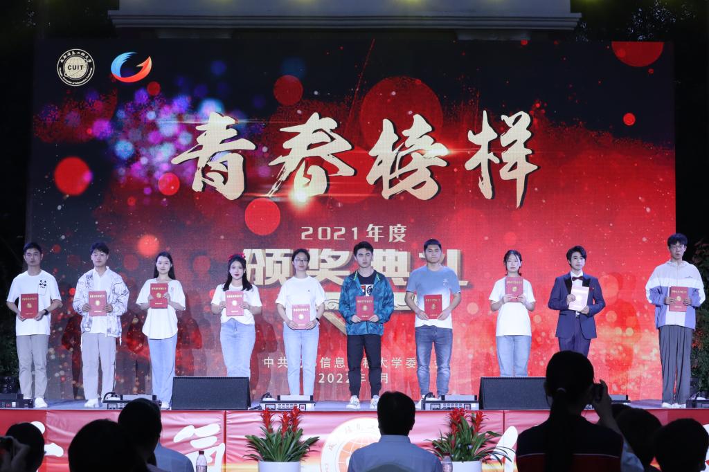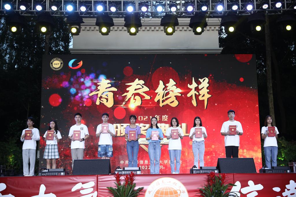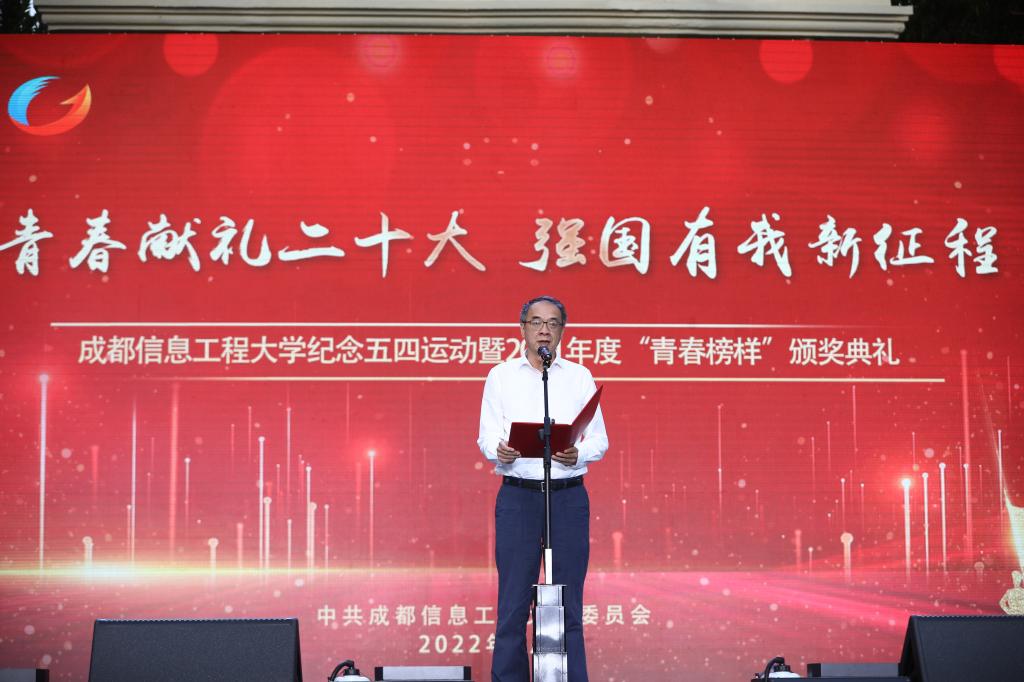 周激流在颁奖典礼上致辞。他代表学校党委和行政向受到表彰的先进个人和集体表示祝贺,向长期致力于“为党育人、为国育才”的教职员工表示感谢,向广大热爱祖国和人民,努力拼搏、青春昂扬,永远跟党走的成信青年学子致以节日的问候。他提到,表彰2021年度“青春榜样”,就是要弘扬五四精神,发扬爱国热情,牢固树立远大理想,用榜样的力量激励广大成信学子拼搏进取、成就自我。他希望,身逢伟大时代的广大成信学子深刻领会、准确把握时代赋予当代青年的责任,要热爱伟大祖国、树立远大理想,牢记习近平总书记的谆谆嘱托和殷切期望,做党的科学理论的学习者、传播者、实践者;要担当时代责任、勇于砥砺奋斗,做新时代中国特色社会主义事业的参与者、实践者,做一名快乐的追梦人、懂得感恩的奋斗者;要练就过硬本领、锤炼品德修为,以时不我待的紧迫感,积极主动学习新知识、新思想,争做德才兼备、知行合一的新时代中国青年。他号召成信学子秉承“成于大气、信达天下”的校训精神,情系国家、放飞青春梦想、书写人生华章,为建设开放的特色鲜明的高水平成都信息工程大学、为实现中华民族伟大复兴的中国梦贡献青春力量。