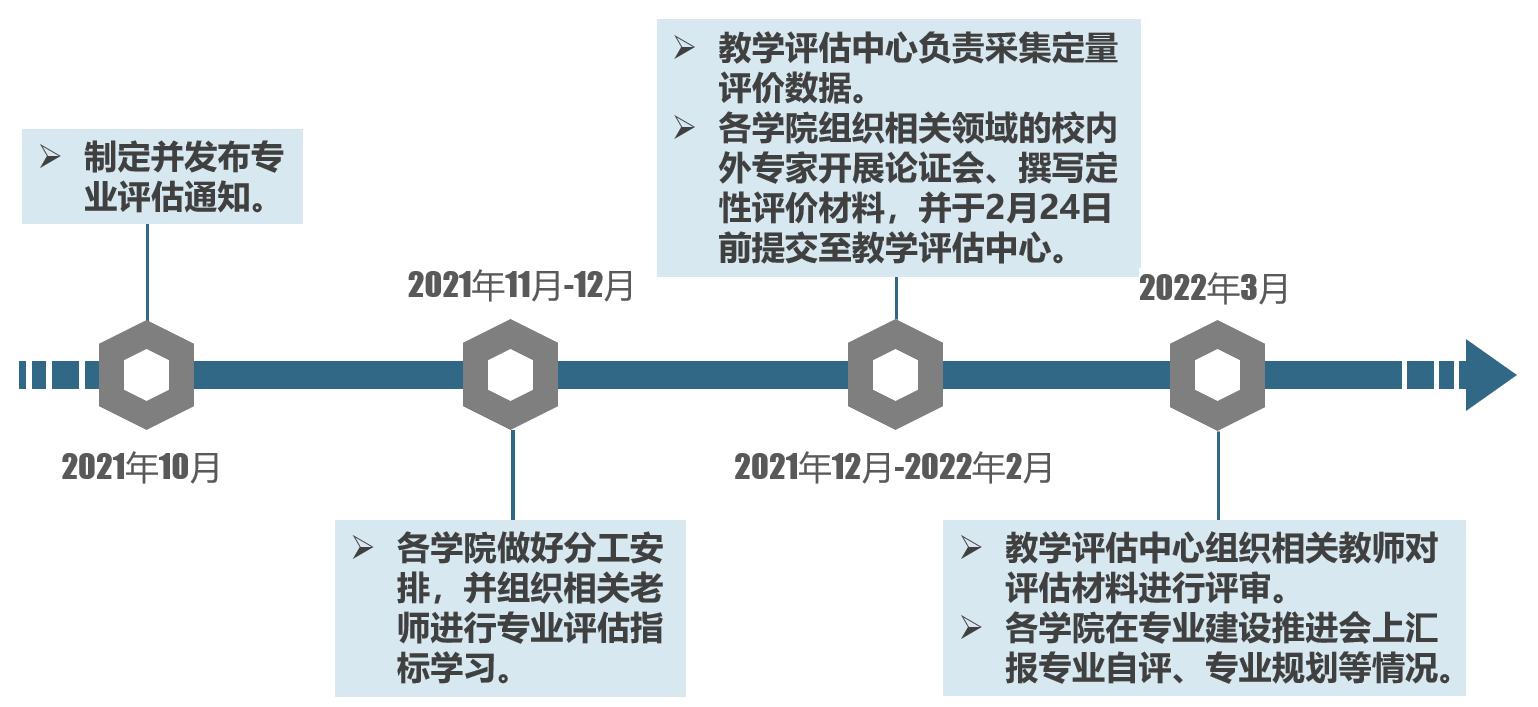 本次专业评估分为四个阶段:第一阶段为方案落实阶段(2021年10月),教学评估中心制定并发布专业评估通知;第二阶段为指标学习阶段(2021年11月-12月),各学院做好分工安排,组织相关教师进行专业评估指标学习;第三阶段为材料收集阶段(2021年12月-2022年2月),教学评估中心负责采集定量评价数据,各学院组织相关领域的校内外专家开展论证会、撰写定性评价材料,并于2月24日前提交至教学评估中心;第四阶段为评议阶段(2022年3月),教学评估中心组织相关专家对评估材料进行评审,各学院在专业建设推进会上汇报专业自评和专业规划等情况。