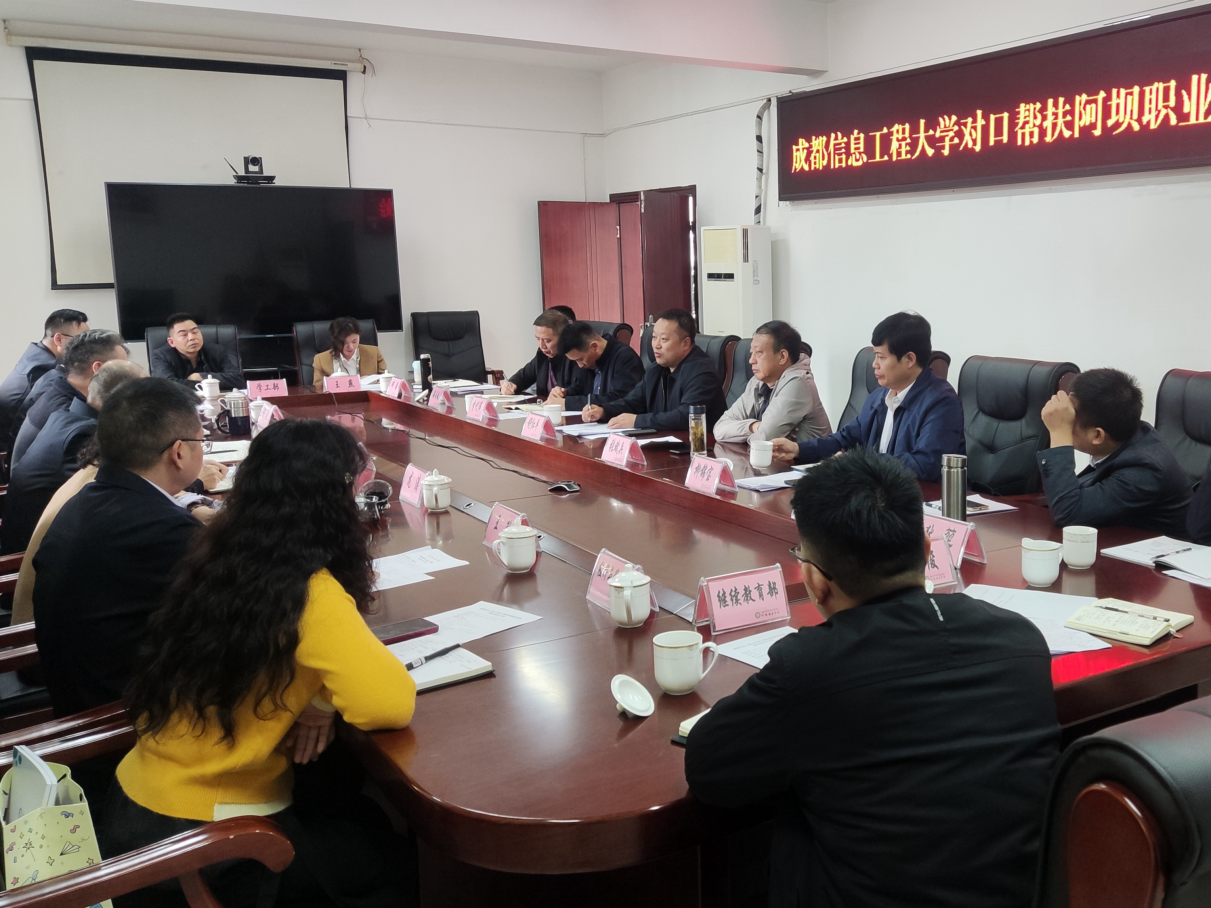 谭可热烈欢迎舒红平一行,他对成都信息工程大学多年来向阿坝职业学院提供的帮助与关心表示诚挚感谢,并充分肯定了学校孙萍教授挂职期间给予的大力支持与帮助,对“成于大气、信达天下”的成信精神表示高度赞扬。