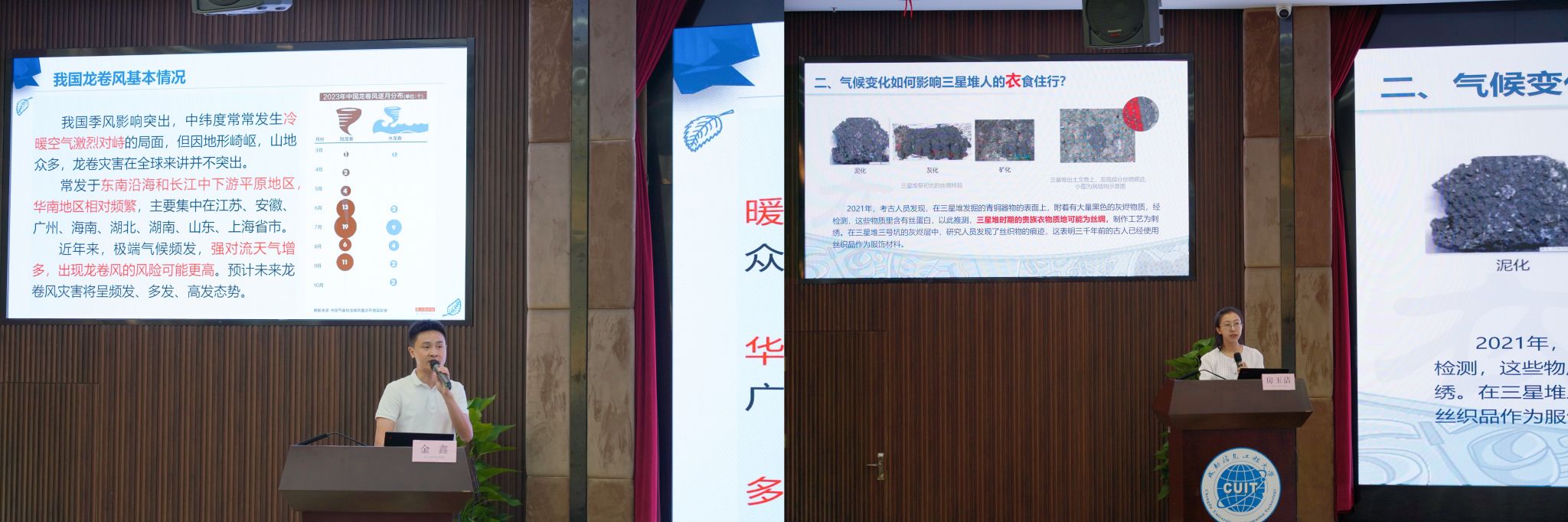 最后,师生们聆听了两场专题讲座。第一场讲座主题为“气候对三星堆文明和大熊猫的影响”,成都市气象局房玉洁工程师通过系统地分析和展示,为师生们揭示了气候变化对古蜀文明发展与变迁的重要影响。第二场讲座主题为“龙卷风的形成、危害及其科学解读”,学校电子工程学院金鑫副教授结合大量科学实验和案例,深入浅出地讲解了龙卷风的气象成因及其危害,并探讨了科学应对措施。