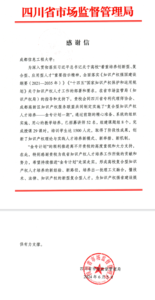 【本网讯】一封感谢信,一份“新”动力。近日,我校收到了一封来自四川省市场监督管理局的感谢信,对我校参与制定和实施的“复合型知识产权人才培养——金专计划一期”(以下简称“金专计划”)项目所取得的阶段性成果进行了肯定,对我校在该项目实施过程中所做的贡献和努力表示了感谢。