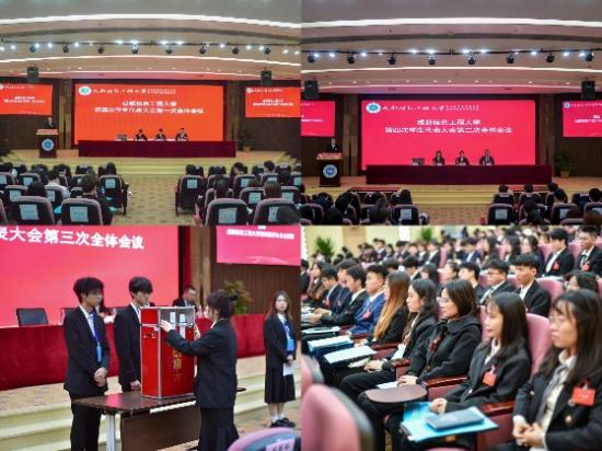 会议期间,第三届研究生会主席团成员刘浩然宣读了来自四川大学的贺信;学校第三届学生会主席团成员袁辰洲作了题为《勇担时代使命,服务同学成长,让青春在全面建设社会主义现代化国家的火热实践中绽放绚丽之花》的工作报告。学校第三届研究生会主席团成员刘浩然作了题为《青春不负韶华,携手共赴未来,为加快建成开放的特色鲜明的高水平成都信息工程大学贡献青春力量》的工作报告。全体代表审议通过了《成都信息工程大学第三届学生会工作报告》、《成都信息工程大学第四次学生代表提案工作报告》、《<成都信息工程大学学生会章程>修订报告》、《成都信息工程大学第三届研究生会工作报告》《成都信息工程大学第四次研究生代表大会提案工作报告》《<成都信息工程大学研究生会章程>修订报告》;并选举产生成都信息工程大学第四届学生委员会及主席团,第四届研究生委员会及主席团。