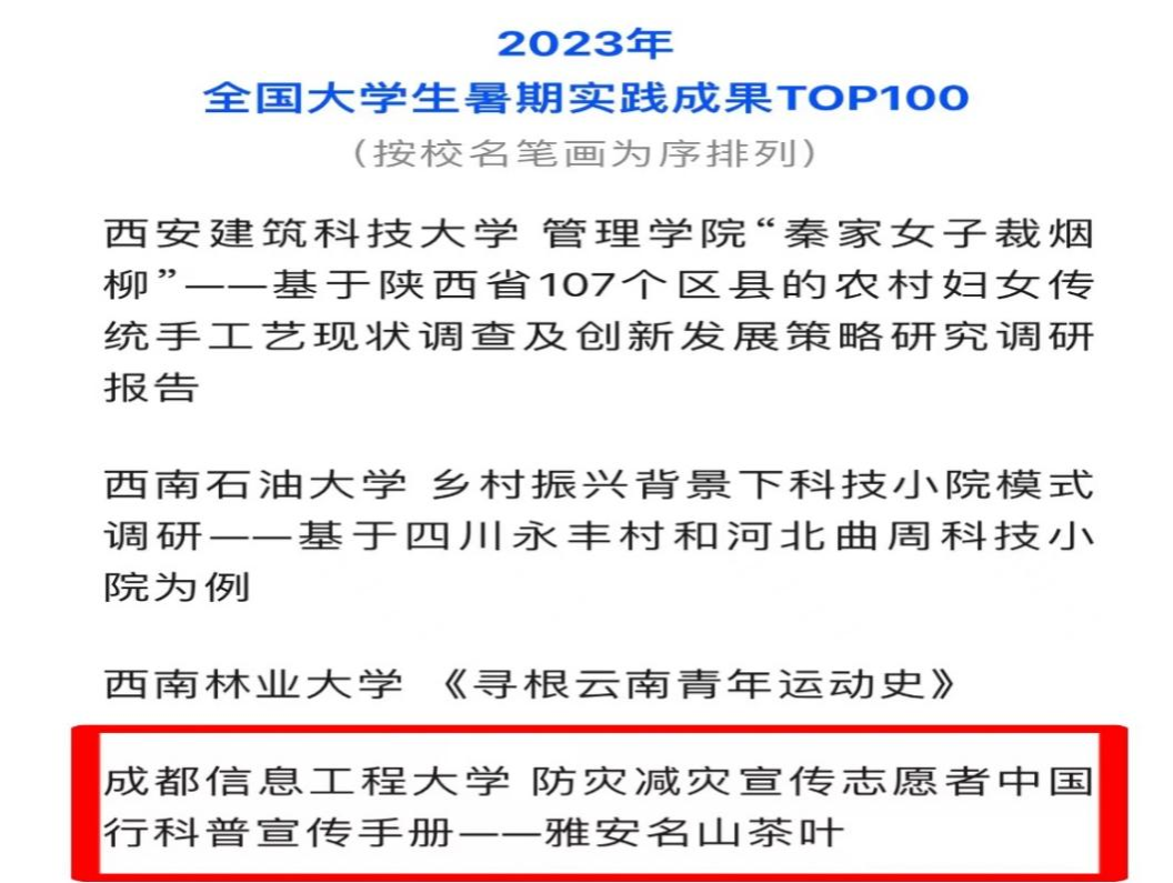 【本网讯】近日,中国青年报公布了2023年第九届全国大学生暑期实践展示活动获奖名单,成都信息工程大学防灾减灾宣传志愿者中国行科普宣传手册——雅安名山茶叶 入选全国大学生暑期实践成果TOP100。