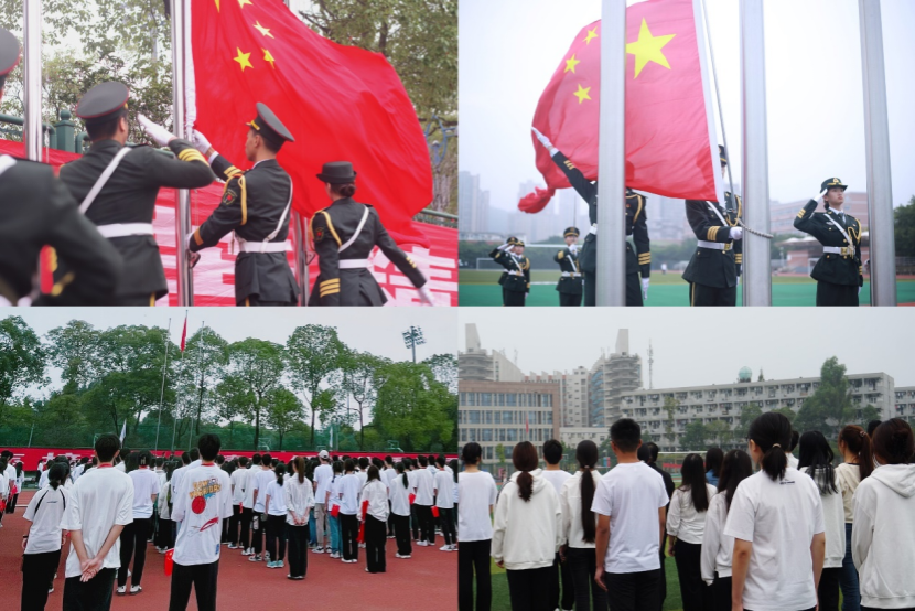 伴随着《义勇军进行曲》的雄壮旋律,国旗护卫队整齐划一地将国旗庄严地升起,五星红旗在晨风中高高飘扬,全体师生向国旗行注目礼,高唱国歌,表达对祖国热爱,共同祝愿伟大祖国繁荣昌盛。