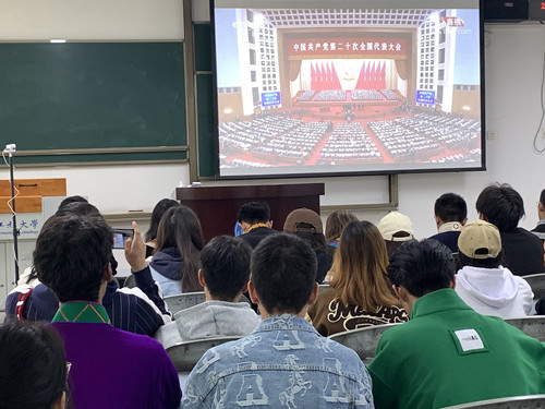 【本网讯】10月16日上午,举国关注的中国共产党第二十次全国代表大会在北京隆重开幕,学校依托“石榴籽”工作室组织两校区各民族师生代表分别在航空港校区4601教室和龙泉校区2101教室集中收看开幕会直播,暂未返校学生在家中观看了大会直播。大家备受鼓舞,倍感振奋,开展了心得体会交流。