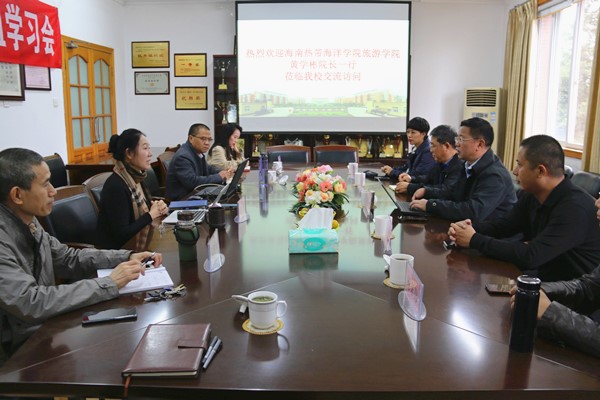 【本网讯】10月15日,海南热带海洋学院旅游学院黄学彬院长一行6人到我校管理学院,就成功申报国家级一流专业建设点进行了专题交流访问。管理学院院长黄萍、副院长孙艳玲及旅游管理与市场营销系主任钱永贵、副主任谢雅丹和部分教师参加了交流座谈会。