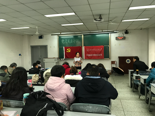 【本网讯】12月28日下午,外国语学院教工党支部全体党员在1406召开党员大会,对党员进行民主评议,会议由支部书记熊成主持,全体无课教师党员参加了会议。