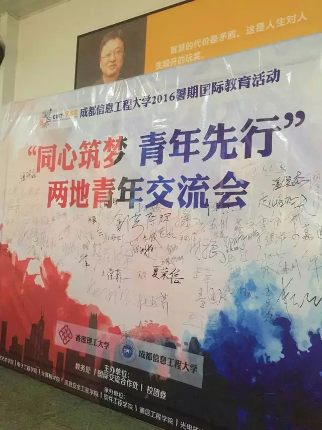 【本网讯】青年同筑中国梦,两地必当携手与共。7月11日晚,由香港理工大学青年代表、映秀小学生代表、成都信息工程大学青年代表参与的“同心筑梦,青年先行”两地青年交流会在学生活动中心拉开了序幕,参加此次交流会的嘉宾有教务处处长陈敏、副处长易平、校团委副书记厉威成、香港理工大学沈文伟博士以及国际交流与合作处、学生工作处部分教师代表。本次两地青年交流会由教务处、国际交流与合作处、校团委主办,文化艺术学院、电子工程学院、计算机学院、信息安全工程学院、软件工程学院、通信工程学院、光电技术学院、控制工程学院、资源环境学院联合承办。