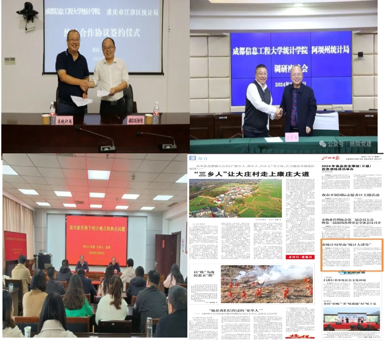 为进一步拓展统计学科教育的质量和统计人才培养的能力,2024年,学院党委先后与四川省阿坝州、德阳市、重庆市江津区、安徽省滁州市、池州市等地统计系统紧密合作,以党建工作为引领,共同推进统计改革创新、提高统计科研能力、提升统计人才培养质量、为政府决策提供高质量统计(技术、人才)支撑。