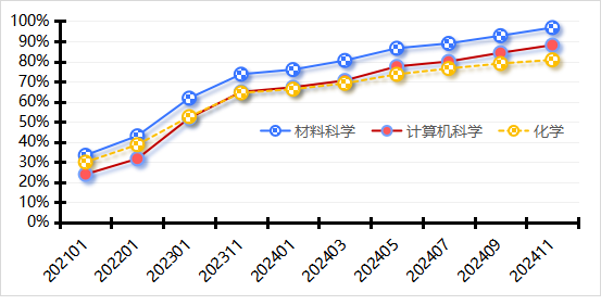材料学、计算机科学与技术、化学接近度进一步提高。材料学较去年同期进步了23个百分点,达到96.79%、计算机科学与技术较去年同期进步了23个百分点,达到88.09%,化学较去年同期进步了16个百分点,达到80.75%,其中材料科学有望2025年3月左右进入。