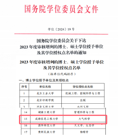 10月,国务院学位委员会关于下达2023年度审核增列的博士、硕士学位授予单位及其学位授权点名单的通知(学位〔2024〕19号),我校成功获批博士学位授予单位,大气科学学科获批为一级学科博士学位授权点,实现了学科建设工作的历史性突破,至此学校形成了从学士、硕士到博士完整的人才培养体系和学位授予体系,办学层次迈上新台阶。此外,我校本次还同时新增气象、翻译和工商管理3个硕士专业学位点,学校所有二级学院均实现了研究生层次的人才培养,学科专业一体化建设开启了新篇章。