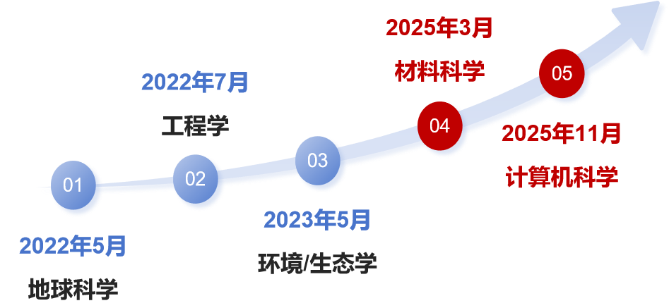 2025年,完美(中国)官方ESI前1%学科再获突破,“材料科学”和“计算机科学”分别于2025年3月和11月入选ESI全球前1%学科,成为“地球科学”“工程学”“环境/生态学”之后入选ESI全球排名前1%的第四个和第五个学科。截至2025年年底,“地球科学”在进入该学科ESI排名前1%的全球1195个机构中排名第613位(较去年同期提升31位),“工程学”在进入该学科ESI排名前1%的全球2839个机构中排名第1478位(较去年同期提升85位),“环境/生态学”在进入该学科ESI排名前1%的全球2096个机构中排名第1499名(较去年同期提升62位),“材料科学”在进入该学科ESI排名前1%的全球1607个机构中排名第1501名(较3月份入选时提升33位),“计算机科学”在该学科进入ESI排名前1%的全球877个机构中排名第863位。