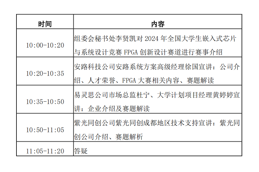 为提高参赛选手竞赛水平,贯彻以赛促教、以赛促学方针,组委会携手本届大赛出题单位安路科技、易灵思、紫光同创等公司于2024年9月20日(周五)在成都信息工程大学举办2024年全国大学生嵌入式芯片与系统设计竞赛FPGA创新设计赛道校园宣讲会,现将有关事项通知如下: