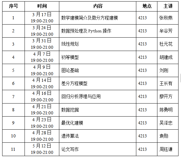 为了培养完美网页版学生的创新意识及运用数学方法和计算机技术解决实际问题的能力,应用数学学院2026年继续组织和指导大学生数学建模竞赛系列活动,竞赛包括:“中国电机工程学会杯”全国大学生电工数学建模竞赛,全国大学生数学建模竞赛,数维杯全国大学生数学建模挑战赛(秋季赛)。应用数学学院数学建模指导组从第3周开始培训,分别从数学建模基础、数学建模算法、数学建模竞赛、数学建模案例分析到常用软件等方面进行培训,培训安排见表1。