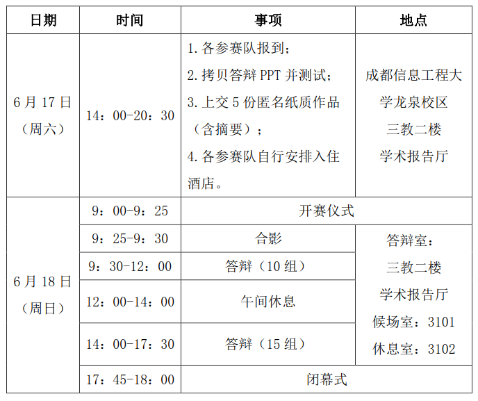 2.比赛当天,在成都信息工程大学龙泉校区3101教室候场,保持设备静音,做好答辩准备。