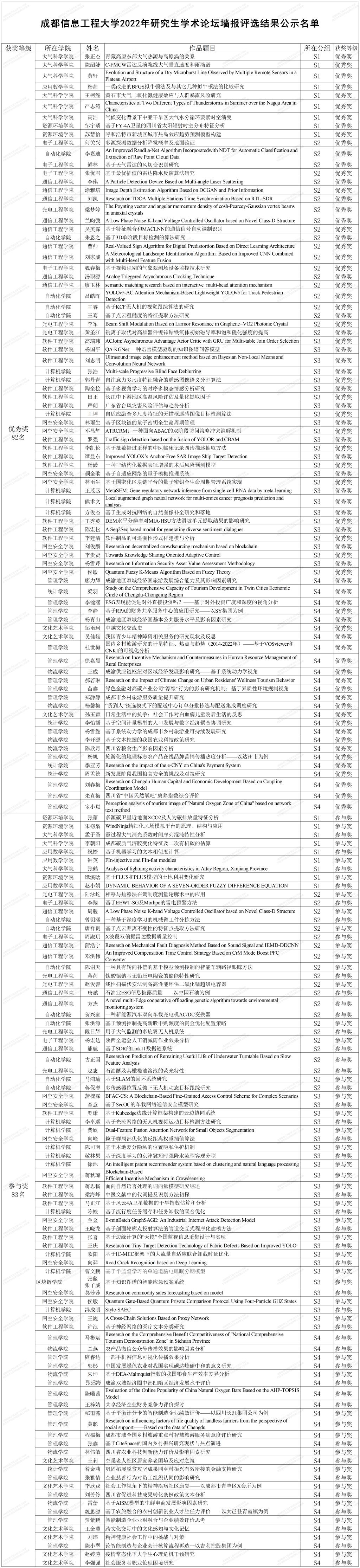 【本网讯】2022年11月10日“成都信息工程大学2022年第五届研究生学术论坛”成功举办。本次论坛经组委会和各学院积极组织前期共收到研究生参赛作品230份,其中包含口头交流报告64个,墙报166件。根据《关于举办成都信息工程大学2022年研究生学术论坛的通知》安排,本次论坛组织分会场评委对现场63个口头交流报告和165件墙报进行评选,现将评选结果予以公示:
