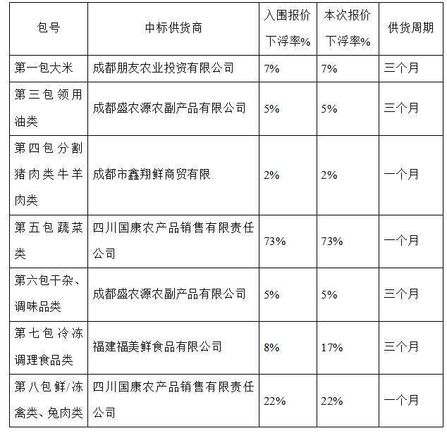 根据框架协议,现将成都信息工程大学2022年度食堂大宗物资采购项目(项目标号:QXZB-2022-0433X)第二阶段第一竞价周期报价竞价,确定以下单位成为成交供货商。结果公示如下: