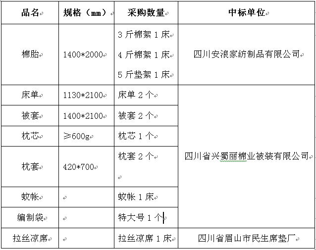 根据四川省纤维检验局提供的质量标准和《成都信息工程大学学生公寓床上用品招标公告》的要求,我校招标小组于2015年6月18日对投标单位提供样品的质量和价格进行综合比选评标,拟确定2015年学生公寓床上用品的中标单位如下: