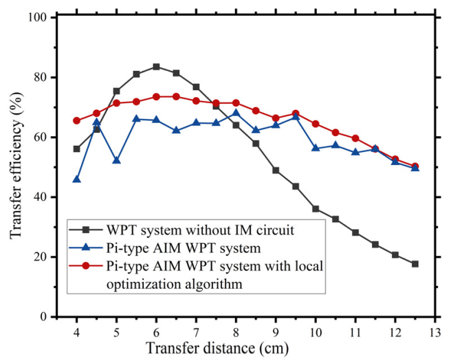 图1.三种情况下WPT系统传输效率比较(没有AIM网络,有AIM网络,AIM网络+寻优算法)