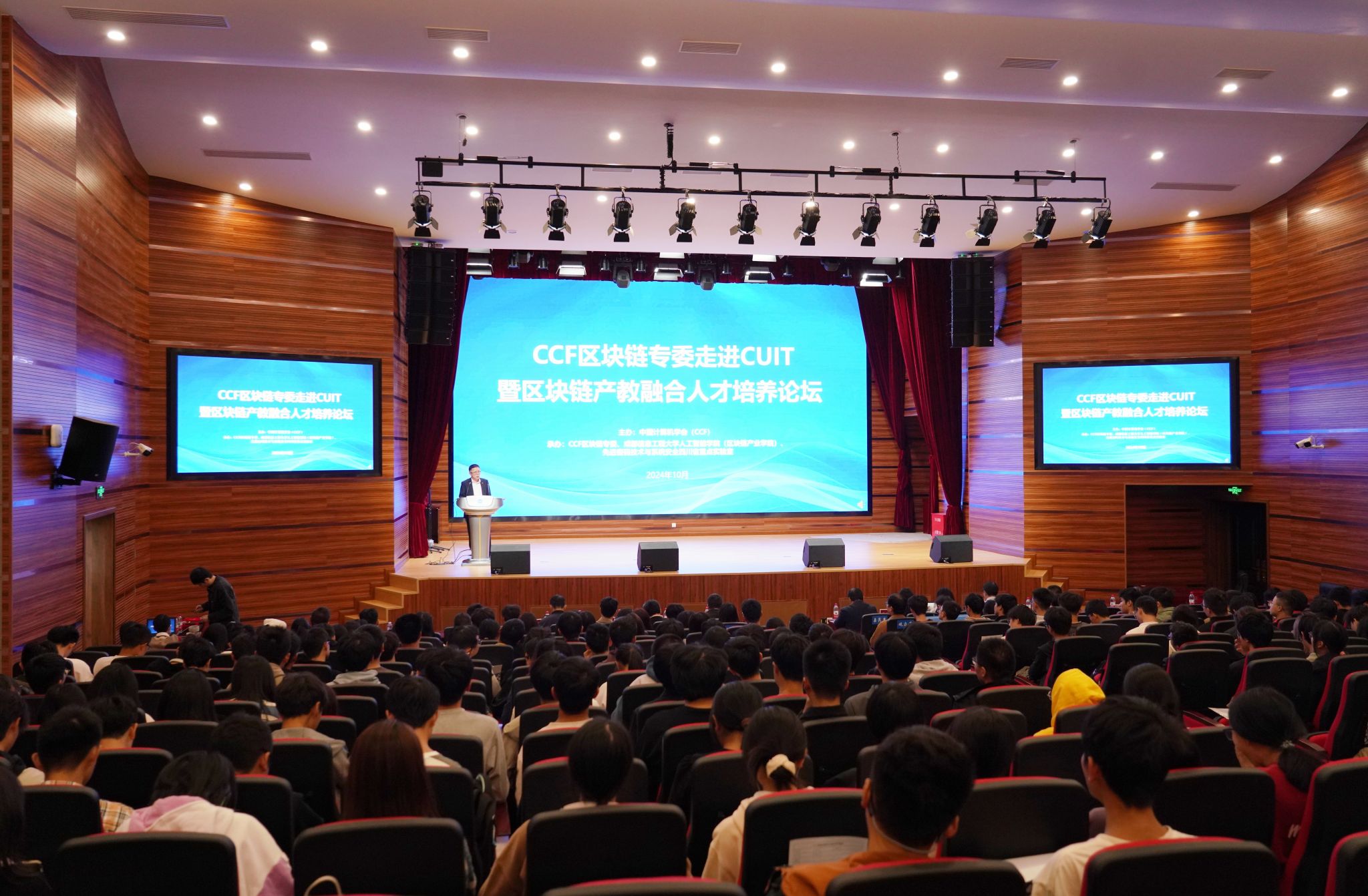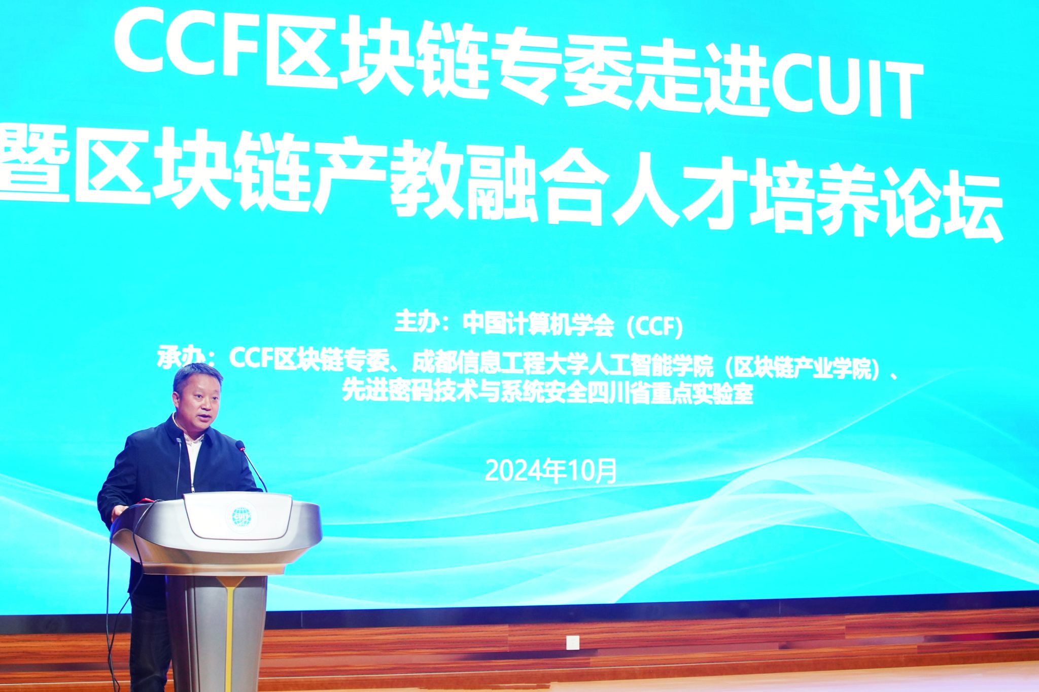 【本网讯】10月26日,由中国计算机学会(CCF)主办,CCF区块链专委、我校人工智能学院(区块链产业学院)、先进密码技术与系统安全四川省重点实验室承办的CCF走进成都信息工程大学暨区块链产教融合人才培养论坛在学校航空港校区成信礼堂举行。活动旨在为区块链领域的学者和研究人员提供一个交流平台,提升高校在区块链领域的教学、科研和应用水平,促进人才培养和专业建设。