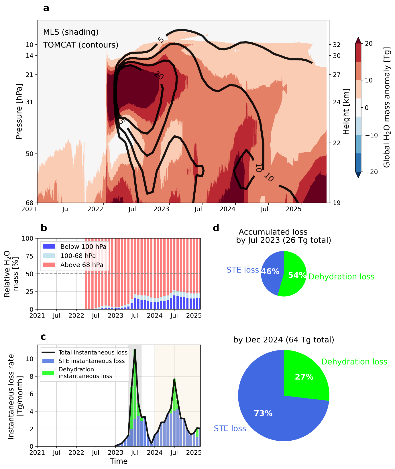 研究表明,在汤加火山喷发后的最初两年中,平流层中水汽异常总量变化较小,但从2024年至2025年初,全球平流层水汽负荷出现了喷发以来最大幅度的下降(图1)。这一结果表明,火山水汽的去除过程已发生阶段性转变,平流层–对流层交换逐渐成为主导去除机制(图2)。综合观测与模拟结果,研究团队估算,此次火山注入水汽的影响可能持续接近十年,平流层水汽异常现象预计将持续到2030年左右,是卫星时代持续时间最长的平流层水汽异常之一。这一发现为评估火山喷发对气候和臭氧恢复的长期影响提供了重要依据。
