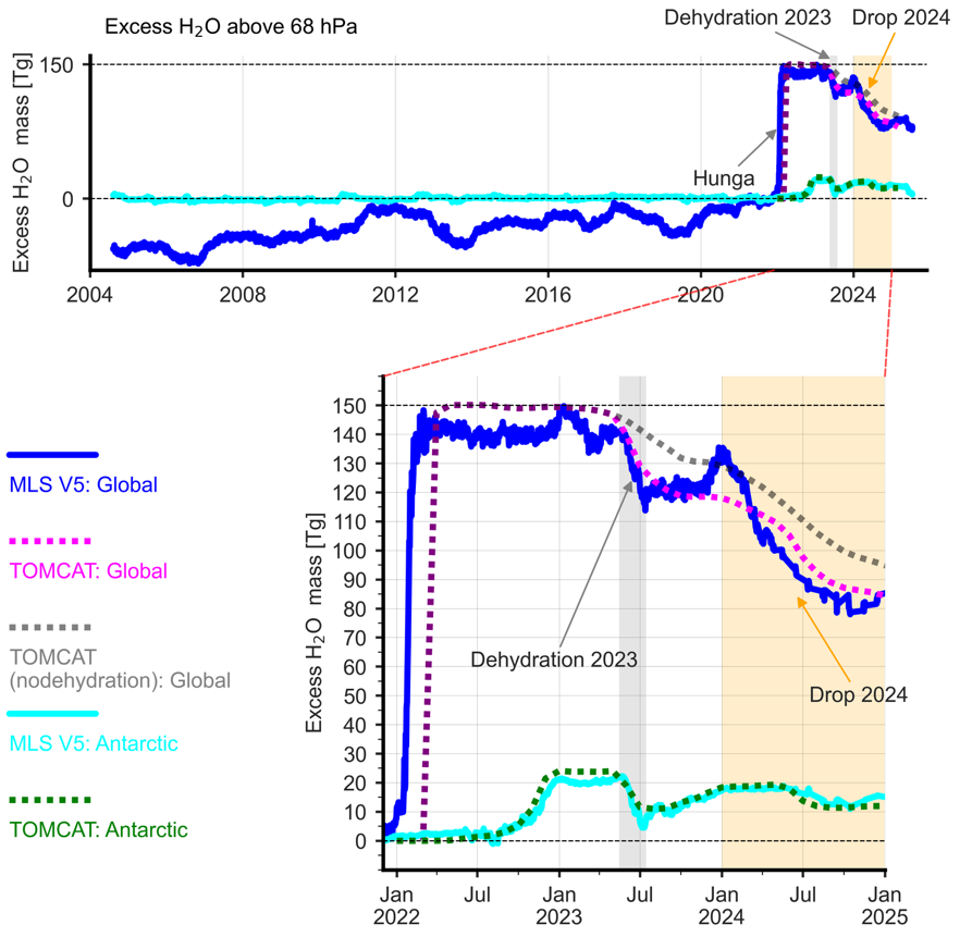 图12024年至2025年初,全球平流层水汽总质量出现大幅下跌。(实线:MLS卫星观测,虚线:全球三维化学传输模型TOMCAT模拟。)