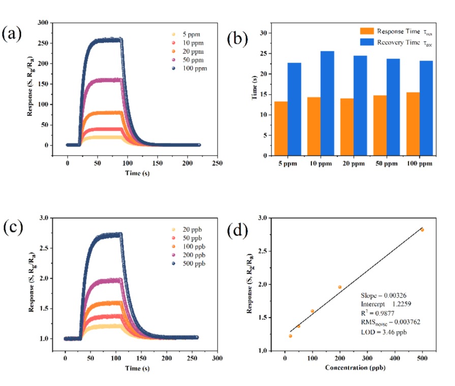 图二材料在250°C下的性能测试:(a)和(b)为ppm级浓度下的响应度以及响应/恢复时间;(c)ppb级浓度下的响应度;(d)基于响应度线性外推的理论检测限