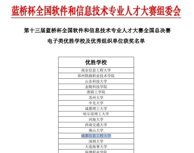 今年的蓝桥杯(电子类)赛事,我校参赛人数和获奖数量再创新高,报名人数达到312人,获奖合计234项,其中获全国一等奖3项,全国二等奖8项,全国三等奖11项,四川省一等奖39项,四川省二等奖80项,四川省三等奖115项。这是我校参加蓝桥杯(电子类)赛事以来所取得的最好成绩,同时我校也荣获了优胜学校单位和优秀组织单位。