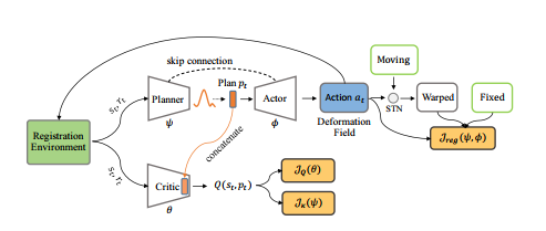 该论文创新性地提出了一种具有随机策略的计划者-执行者-评论家强化学习模型。该模型可有效解决强化学习模型因状态空间和动作空间过大而无法处理图像柔性配准问题的缺陷,是国际上首次提出使用强化学习完成图像柔性配准的工作。本文在多种医学图像配准数据集上对该方法进行评估,实验结果表明此方法超越了当前该领域的先进模型,具有优异的配准效果。